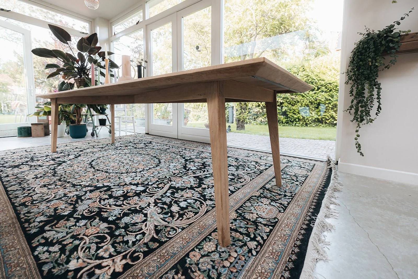 Een eettafel van massief eiken 320 cm lang. De rand met facet van 60 graden geeft de tafel een bijzonder uiterlijk. Foto’s van Jeanine Verbraak Concepts.