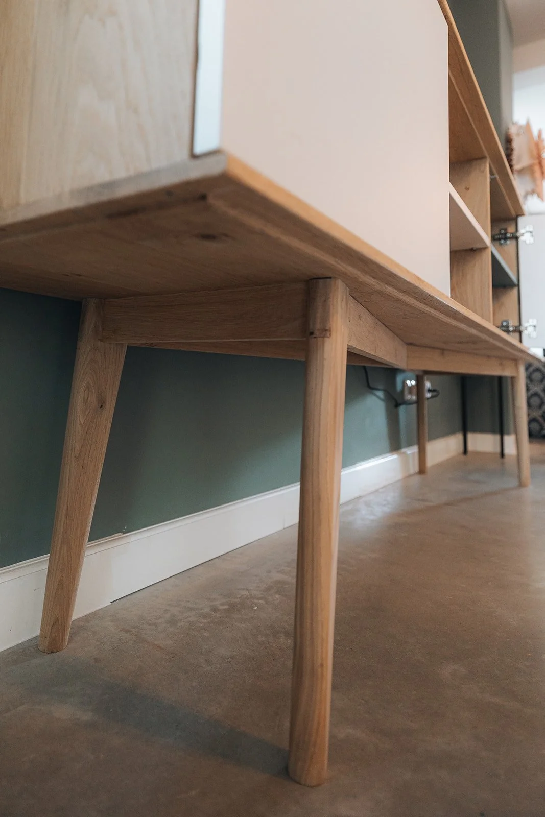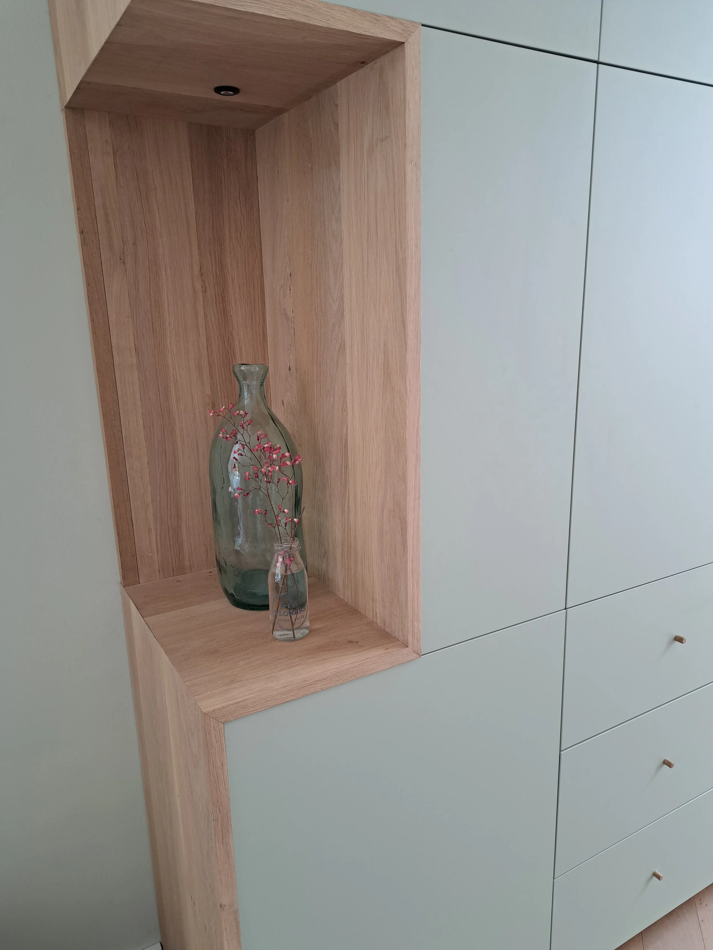 Een kast met open vakken van massief eiken. De deuren zijn van meubelpanelen in de kleur groen.